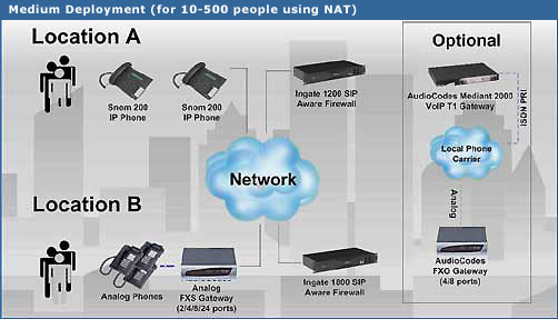 A (40 users) has an Ingate 1200, whereas Location B (400